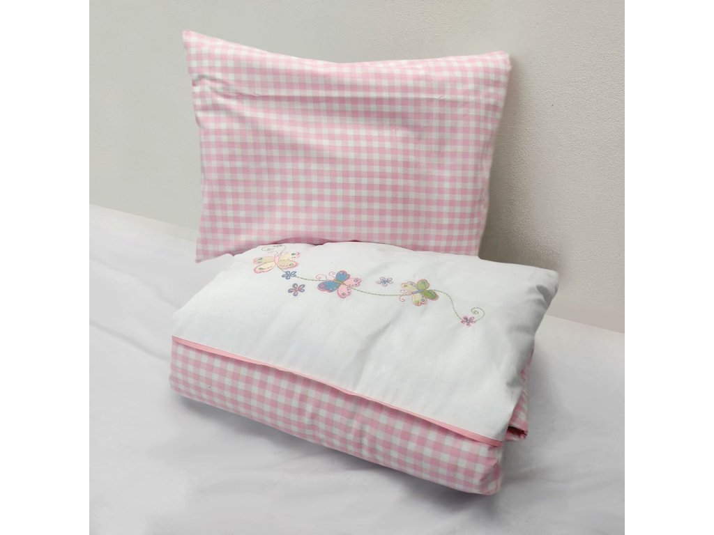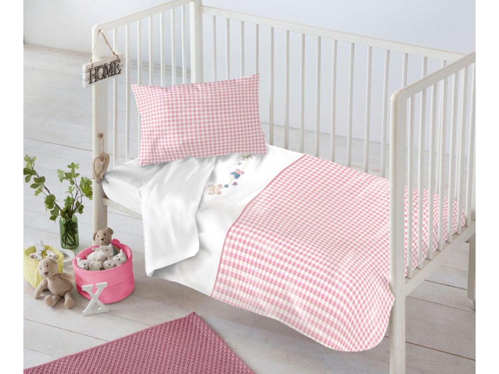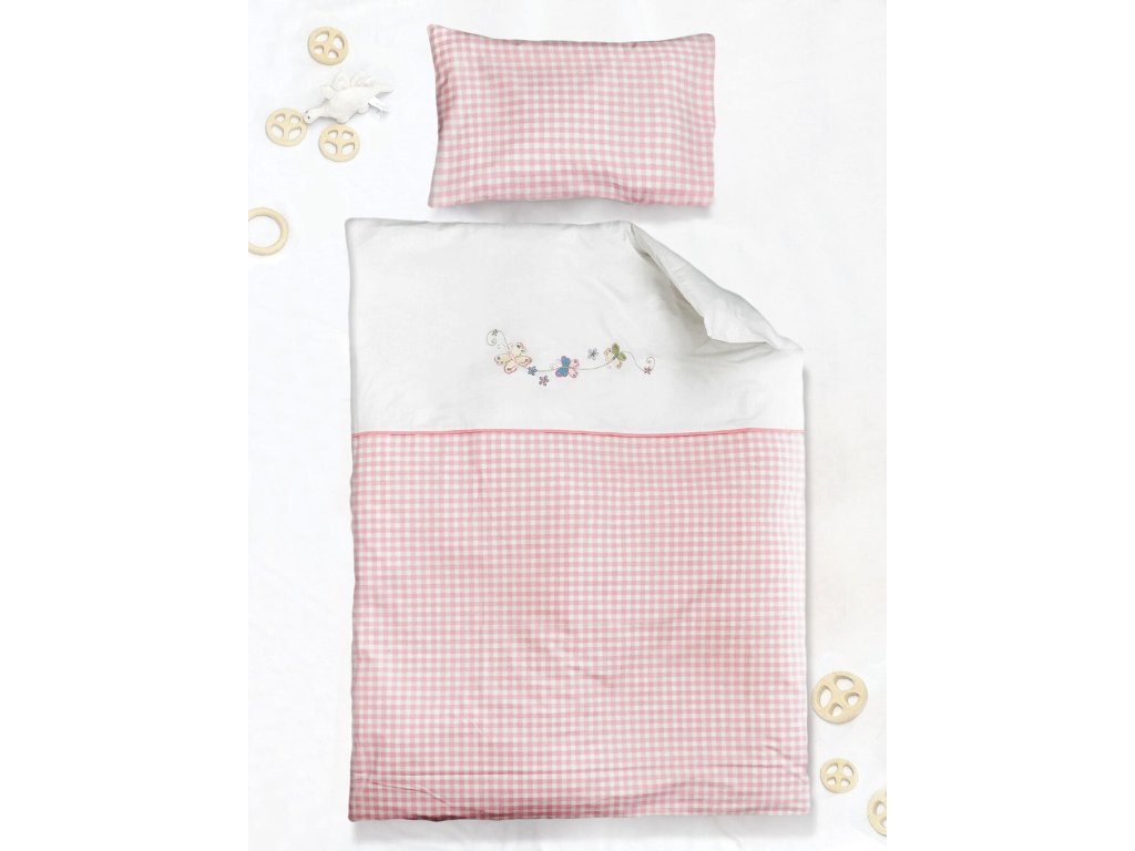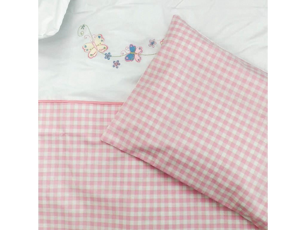 Prednú stranu obliečky na perinku tvorí pestrotkaná tkanina v sviežich ružových tónoch s vytkaným štvorčekovým vzorom, skombinovaná so sneho-bielou tkaninou s krásnou farebnou výšivkou z kvalitných stálofarebných priadzí, ktorá dodáva obliečkam šmrnc.