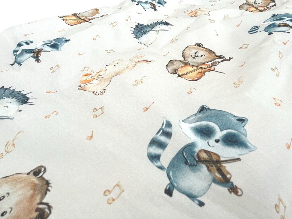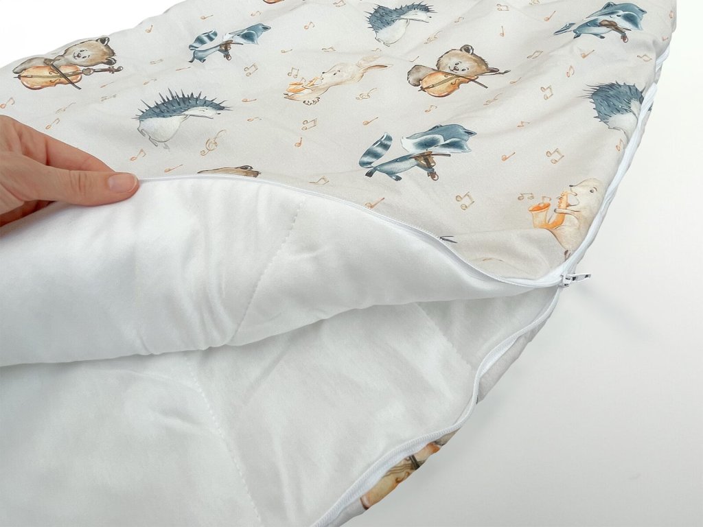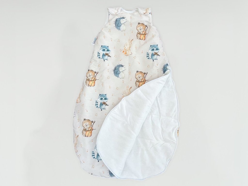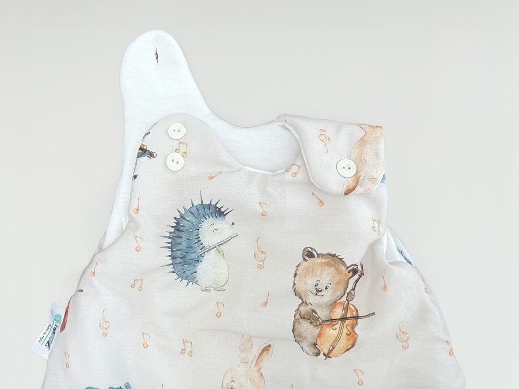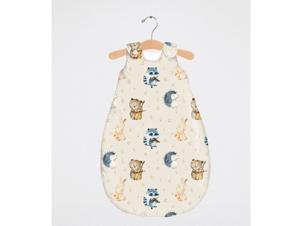 Detský spací vak s digitálnou potlačou zvieracích muzikantov na béžovom podklade. Vnútro vaku je tvorené prírodným TENCEL™ Lyocell vláknom, ktoré dokonale odvádza vlhkosť a je mimoriadne šetrné k detskej pokožke.