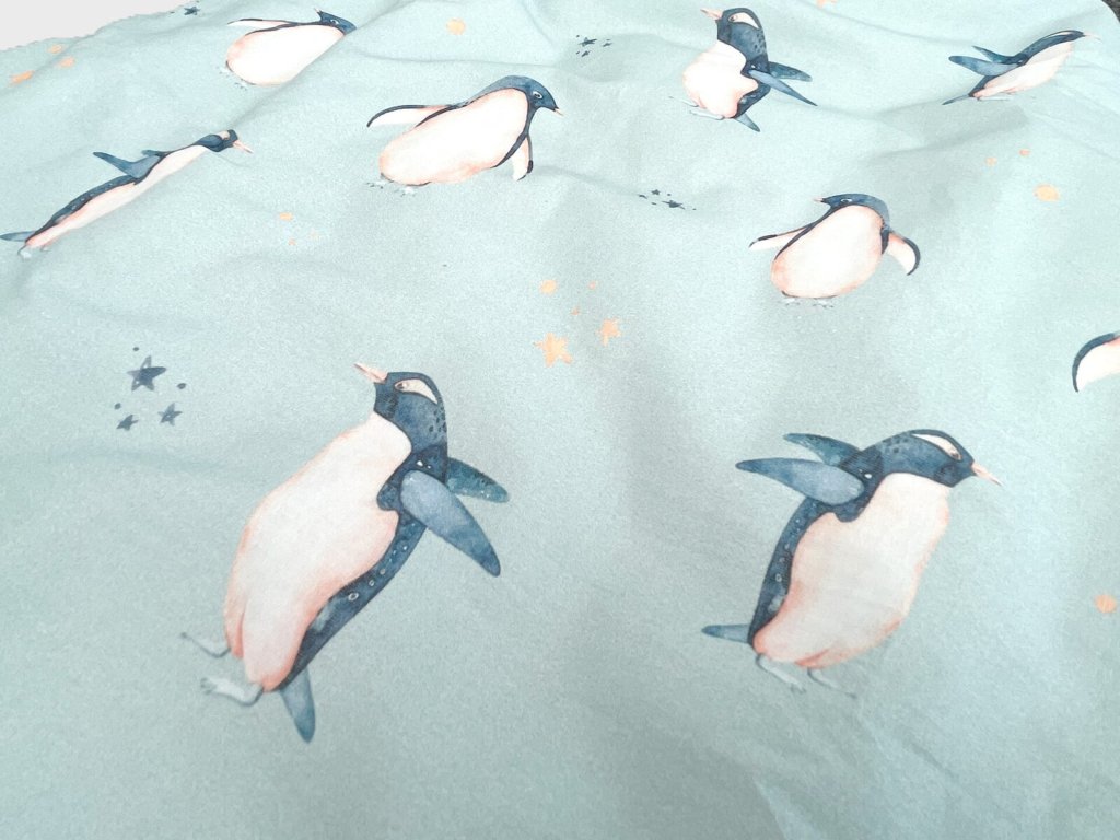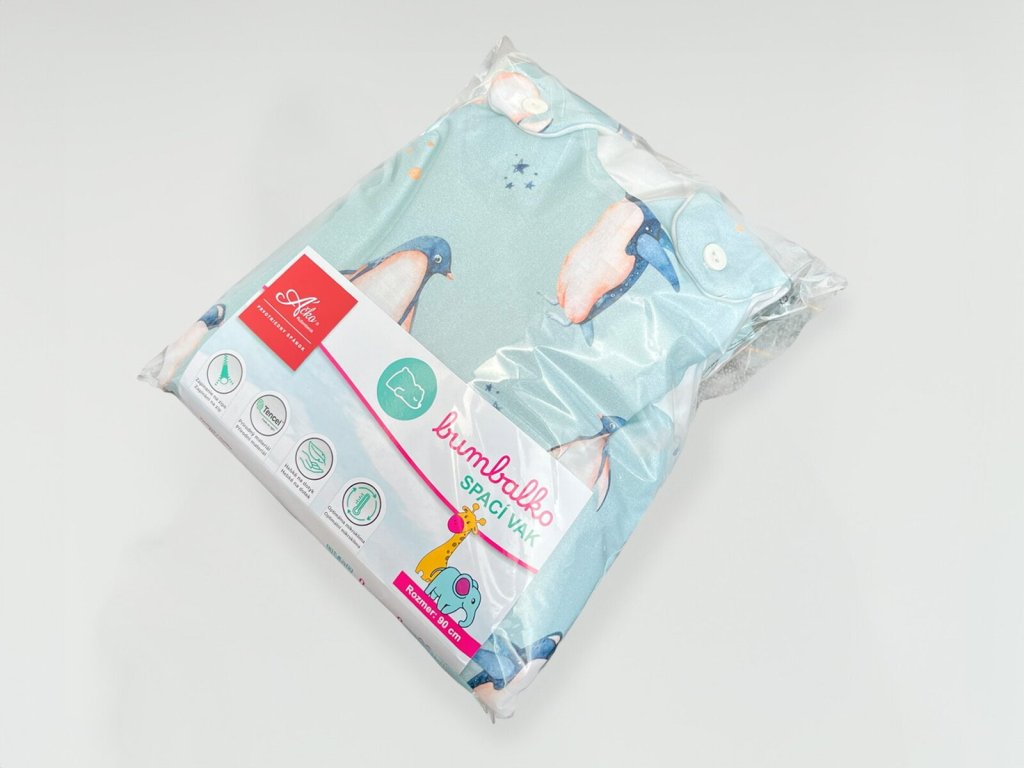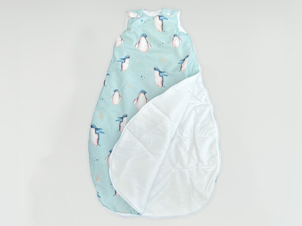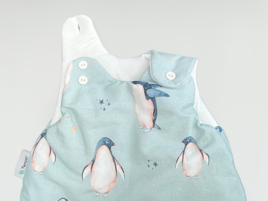 Detský spací vak s digitálnou potlačou tučniakov na svetlo modrom podklade. Vnútro vaku je tvorené prírodným TENCEL™ Lyocell vláknom, ktoré dokonale odvádza vlhkosť a je mimoriadne šetrné k detskej pokožke.