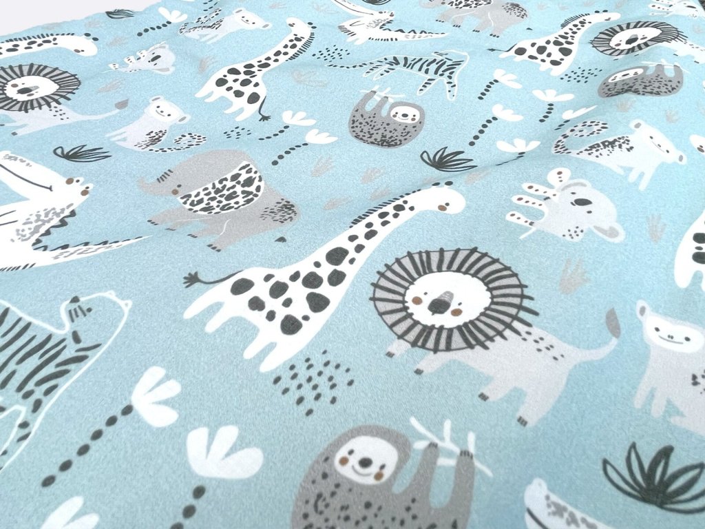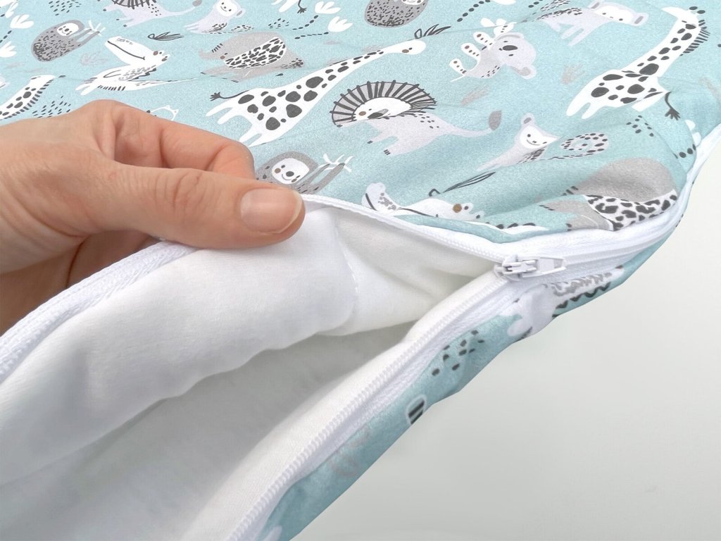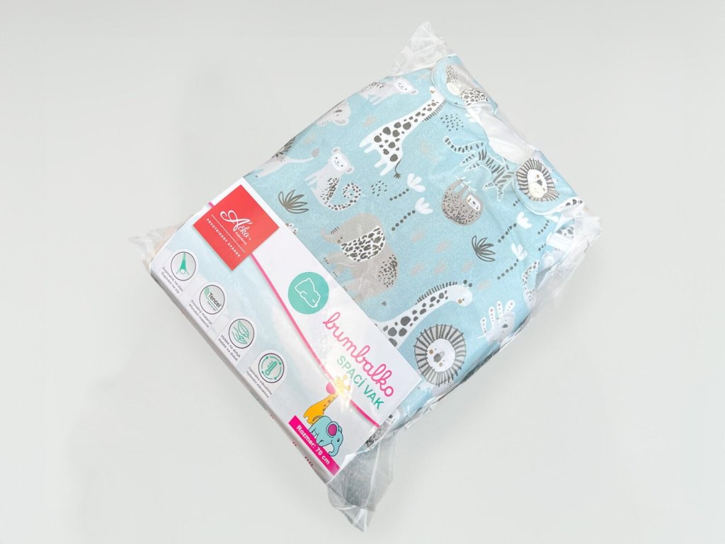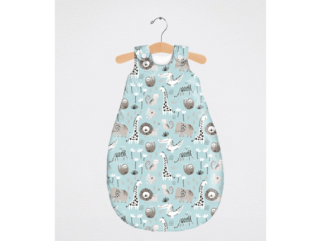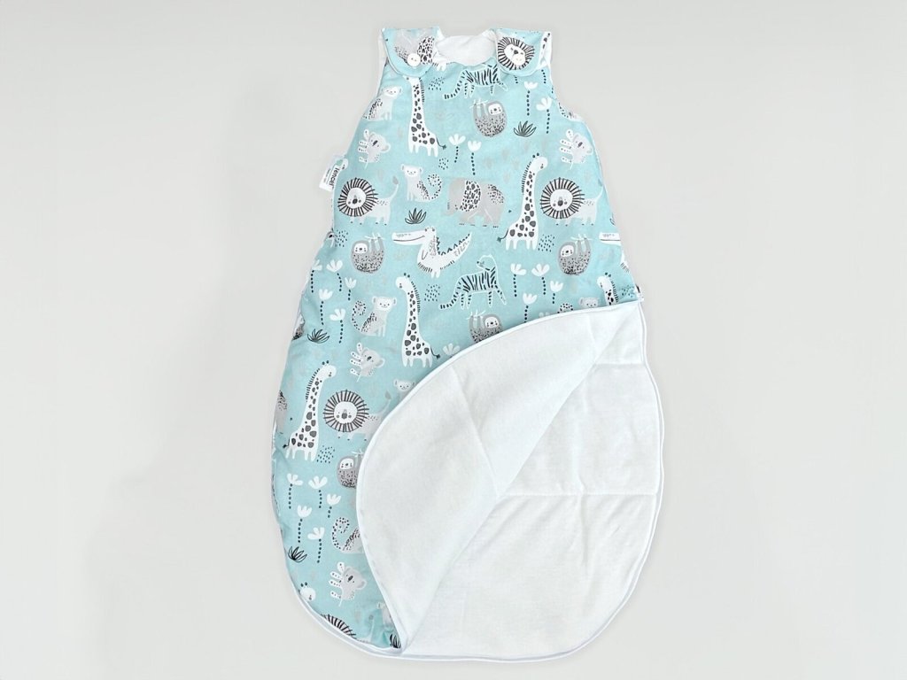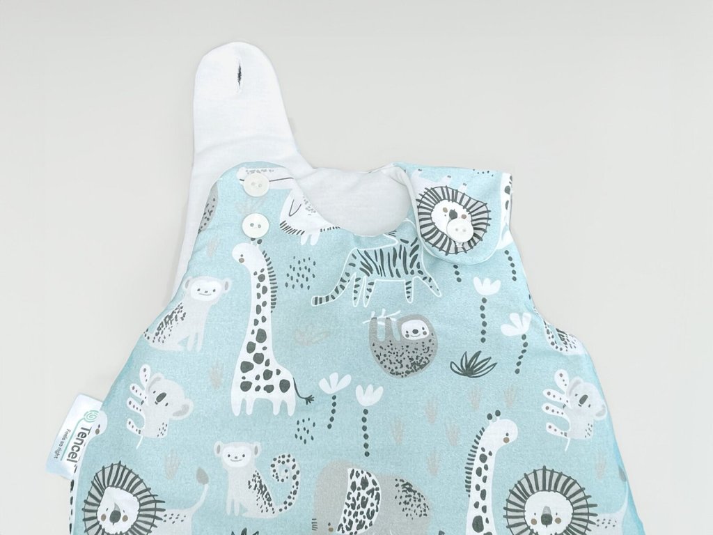 Detský spací vak s digitálnou potlačou safari zvieratiek na modrom podklade. Vnútro vaku je tvorené prírodným TENCEL™ Lyocell vláknom, ktoré dokonale odvádza vlhkosť a je mimoriadne šetrné k detskej pokožke.