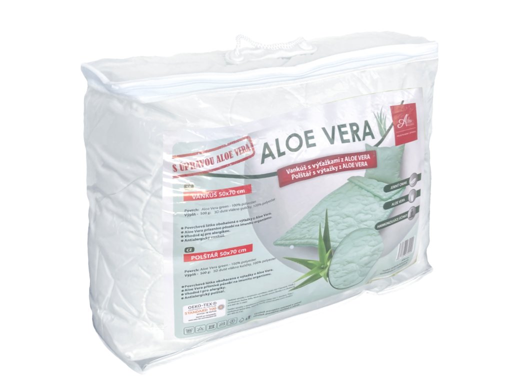 Vankúš ALOE VERA WHITE s dvojitým obalom zabezpečuje vysoký komfort počas spánku. Je obohatený o výťažky z Aloe Vera, ktoré podporujú imunitu a obranyschopnosť tela. Jeho harmonizujúce účinky zaisťujú hlboký a kvalitný spánok.