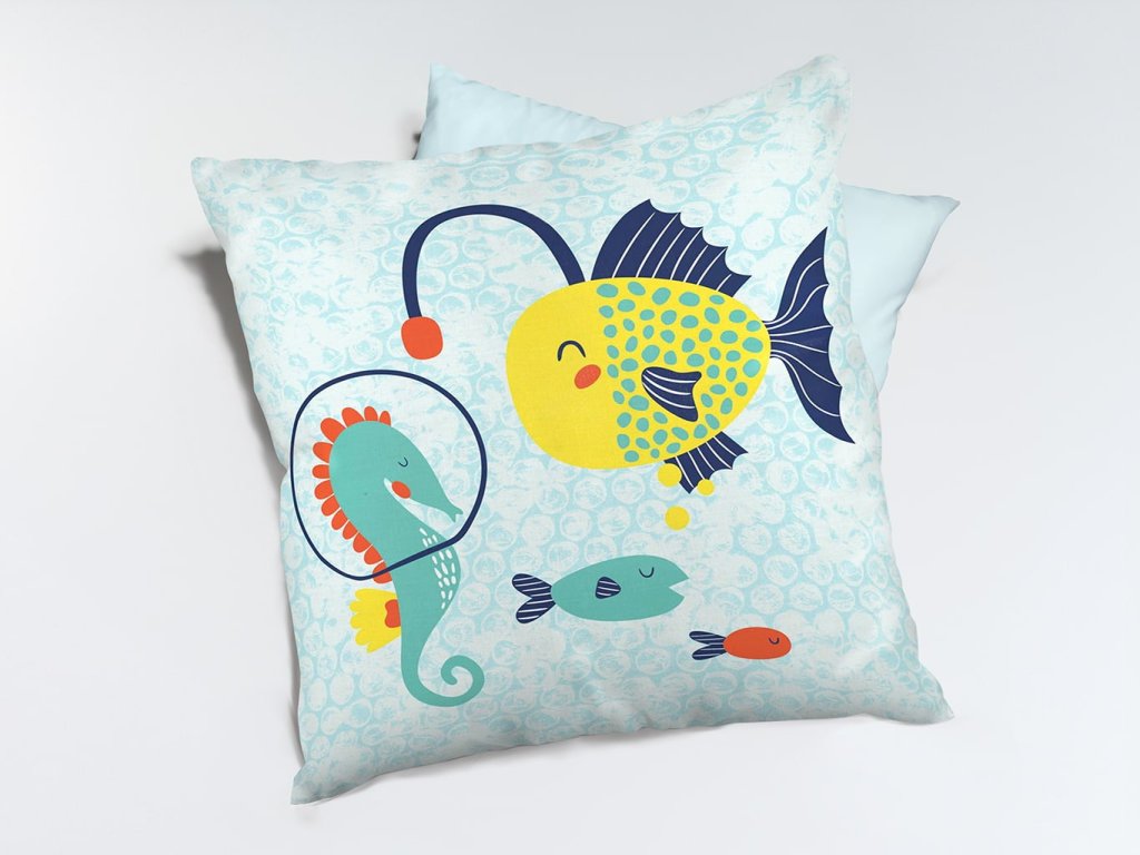 Bavlnený vankúš s veselou potlačou rybiek v akváriu poteší všetky detičky. Detskej izbe dodá nádych radosti so svojou digitálnou fototlačou na 100% bavlne a jemnou polyesterovou výplňou. Vďaka zipsovému uzáveru je ľahko odnímateľný a umývateľný.