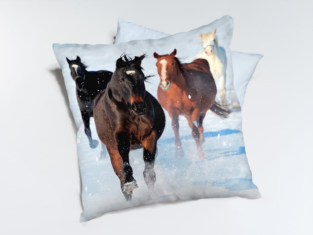 Dekoračný vankúšik s divokým motívom koní, vyrobený s dôrazom na detajl.
